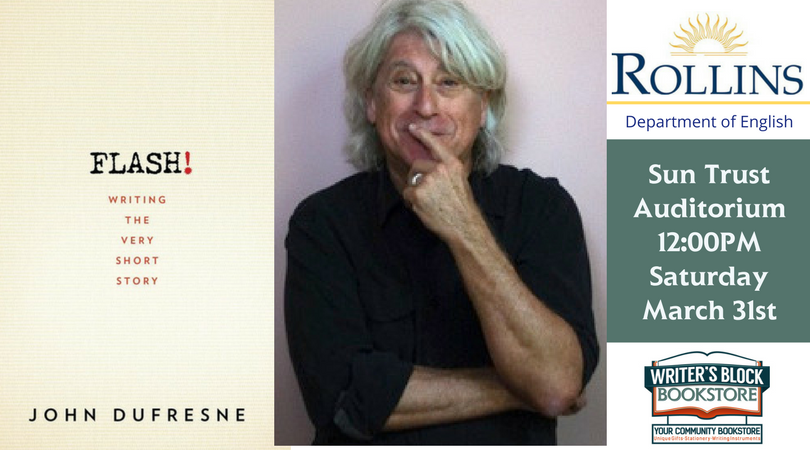 Writer’s Block Bookstore and Rollins College, English Department are honored to present author, teacher, and playwright John DuFresne on Saturday, March 31st at the SunTrust Auditorium. DuFresne will be discussing his newest work, FLASH!: Writing the Very Short Story, and invites attendees to participate in an interactive flash fiction exercise.